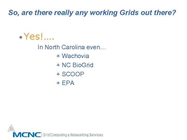 So, are there really any working Grids out there? • Yes!…. In North Carolina even… + Wachovia + NC Bio. Grid + SCOOP + EPA