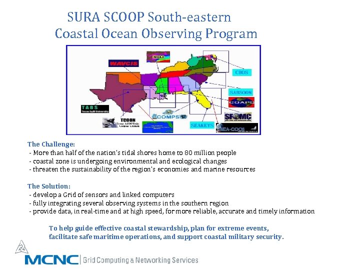 SURA SCOOP South-eastern Coastal Ocean Observing Program The Challenge: - More than half of the nation's tidal shores home to 80 million people - coastal zone is undergoing environmental and ecological changes - threaten the sustainability of the region's economies and marine resources The Solution: - develop a Grid of sensors and linked computers - fully integrating several observing systems in the southern region - provide data, in real-time and at high speed, for more reliable, accurate and timely information To help guide effective coastal stewardship, plan for extreme events, facilitate safe maritime operations, and support coastal military security.
