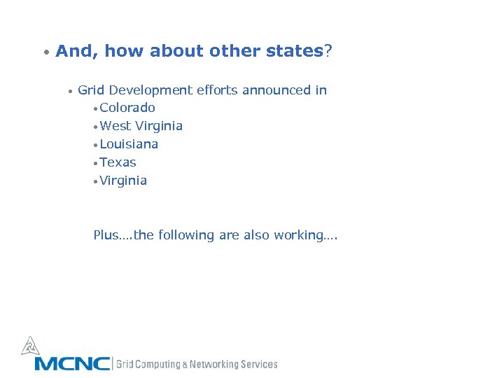 • And, how about other states? • Grid Development efforts announced in • Colorado • West Virginia • Louisiana • Texas • Virginia Plus…. the following are also working….
