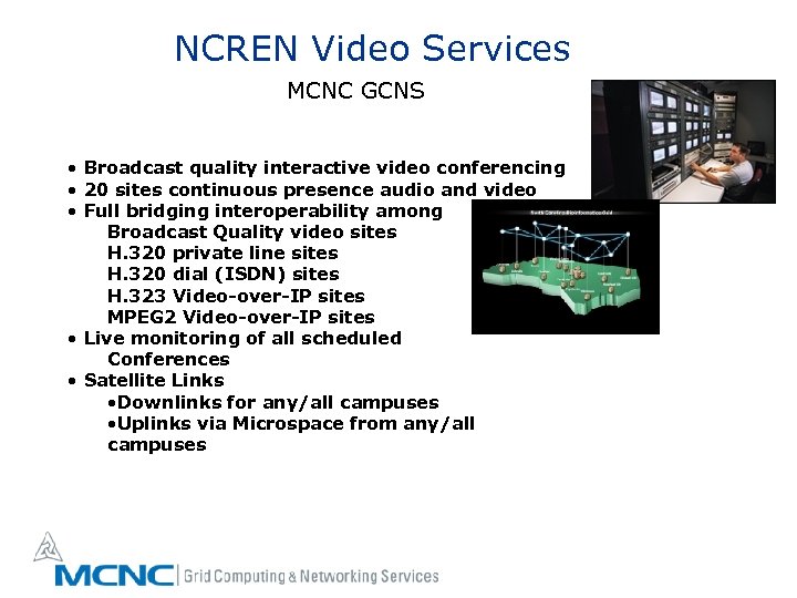 NCREN Video Services MCNC GCNS • Broadcast quality interactive video conferencing • 20 sites continuous presence audio and video • Full bridging interoperability among Broadcast Quality video sites H. 320 private line sites H. 320 dial (ISDN) sites H. 323 Video-over-IP sites MPEG 2 Video-over-IP sites • Live monitoring of all scheduled Conferences • Satellite Links • Downlinks for any/all campuses • Uplinks via Microspace from any/all campuses