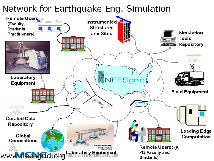 Network for Earthquake Eng. Simulation Remote Users (Faculty, Students, Practitioners) Instrumented Structures and Sites Simulation Tools Repository Laboratory Equipment Field Equipment Curated Data Repository Leading Edge Computation Global Connections Remote Users: (K www. neesgrid. org Laboratory Equipment -12 Faculty and Students)