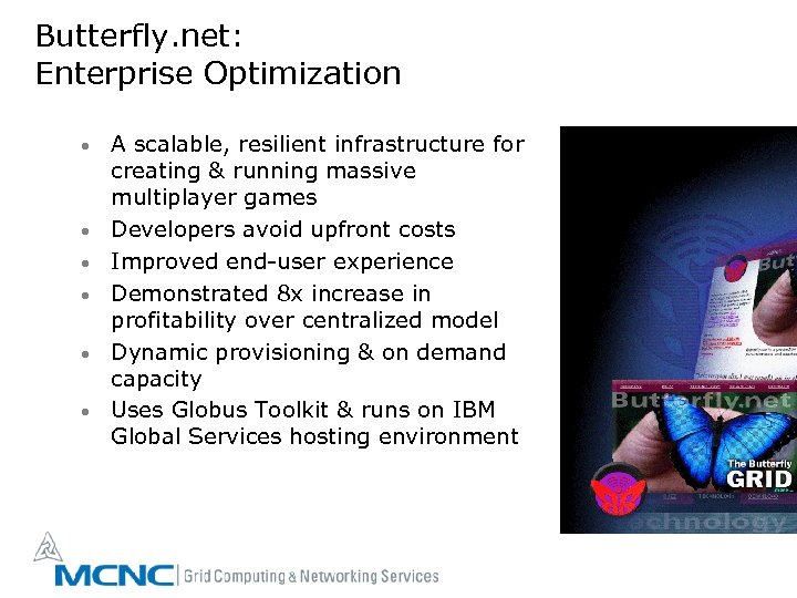 Butterfly. net: Enterprise Optimization • • • A scalable, resilient infrastructure for creating & running massive multiplayer games Developers avoid upfront costs Improved end-user experience Demonstrated 8 x increase in profitability over centralized model Dynamic provisioning & on demand capacity Uses Globus Toolkit & runs on IBM Global Services hosting environment