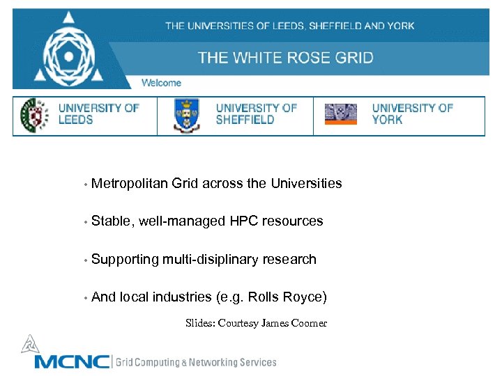 • Metropolitan Grid across the Universities • Stable, well-managed HPC resources • Supporting multi-disiplinary research • And local industries (e. g. Rolls Royce) Slides: Courtesy James Coomer