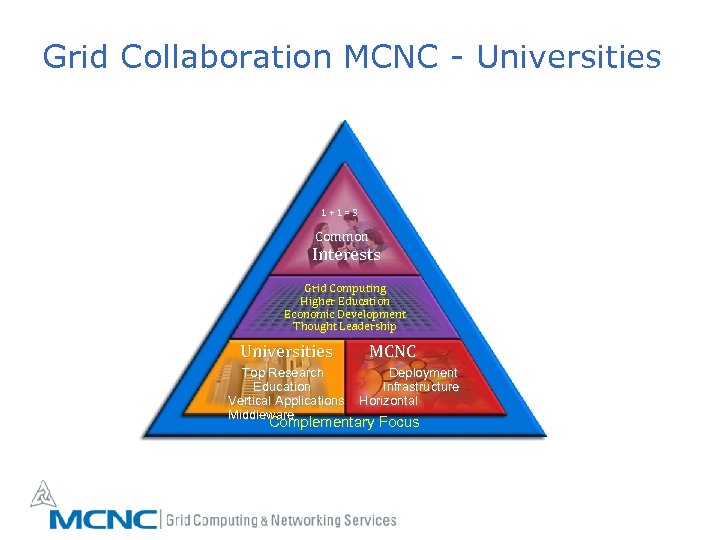 Grid Collaboration MCNC - Universities 1+1=3 Common Interests Grid Computing Higher Education Economic Development Thought Leadership Universities Top Research Education Vertical Applications Middleware MCNC Deployment Infrastructure Horizontal Complementary Focus