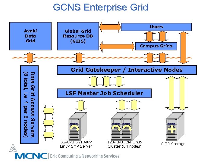 GCNS Enterprise Grid Avaki Data Grid Global Grid Resource DB (GIIS) Users Campus Grids Data Grid Access Servers (8 total, i. e. 1 per 8 nodes) Grid Gatekeeper / Interactive Nodes LSF Master Job Scheduler 32 -CPU SGI Altix Linux SMP Server 128 -CPU IBM Linux Cluster (64 nodes) 8 -TB Storage