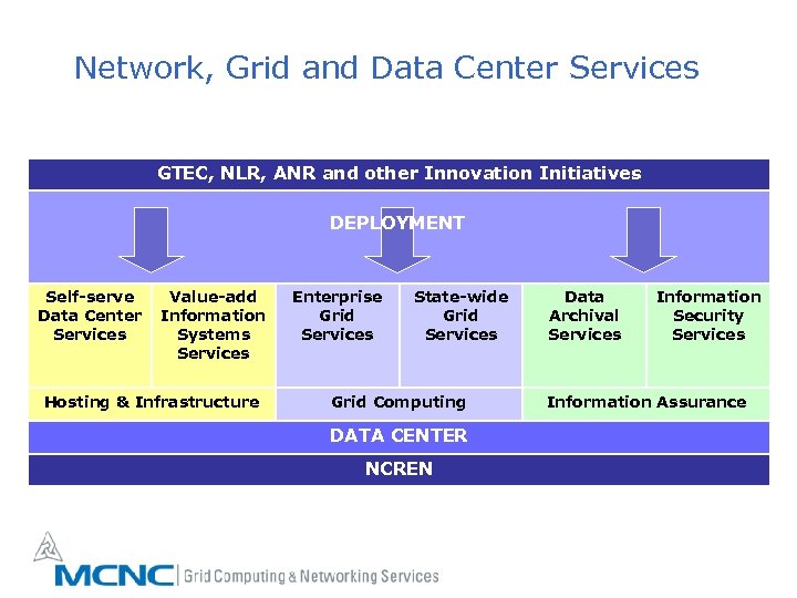 Network, Grid and Data Center Services GTEC, NLR, ANR and other Innovation Initiatives DEPLOYMENT Self-serve Data Center Services Value-add Information Systems Services Hosting & Infrastructure Enterprise Grid Services State-wide Grid Services Grid Computing DATA CENTER NCREN Data Archival Services Information Security Services Information Assurance