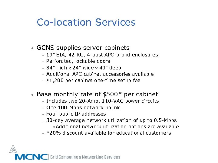 Co-location Services • GCNS supplies server cabinets – – – • 19” EIA, 42 -RU, 4 -post APC-brand enclosures Perforated, lockable doors 84” high x 24” wide x 40” deep Additional APC cabinet accessories available $1, 200 per cabinet one-time setup fee Base monthly rate of $500* per cabinet – – – Includes two 20 -Amp, 110 -VAC power circuits One 100 -Mbps network uplink Four public IP addresses 30 -day average network utilization of up to 0. 5 -Mbps • Additional network utilization options are available *20% discount available for educational customers