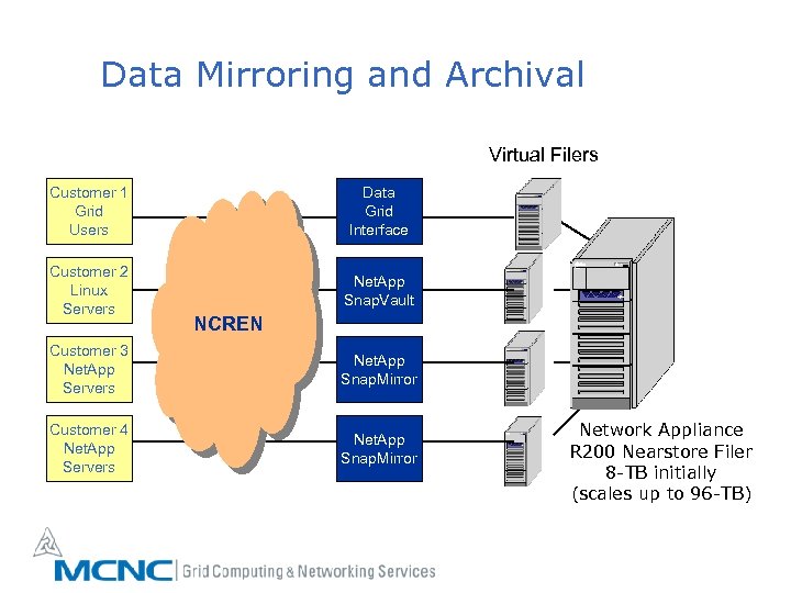 Data Mirroring and Archival Virtual Filers Customer 1 Grid Users Data Grid Interface Customer 2 Linux Servers Net. App Snap. Vault NCREN Customer 3 Net. App Servers Net. App Snap. Mirror Customer 4 Net. App Servers Net. App Snap. Mirror Network Appliance R 200 Nearstore Filer 8 -TB initially (scales up to 96 -TB)