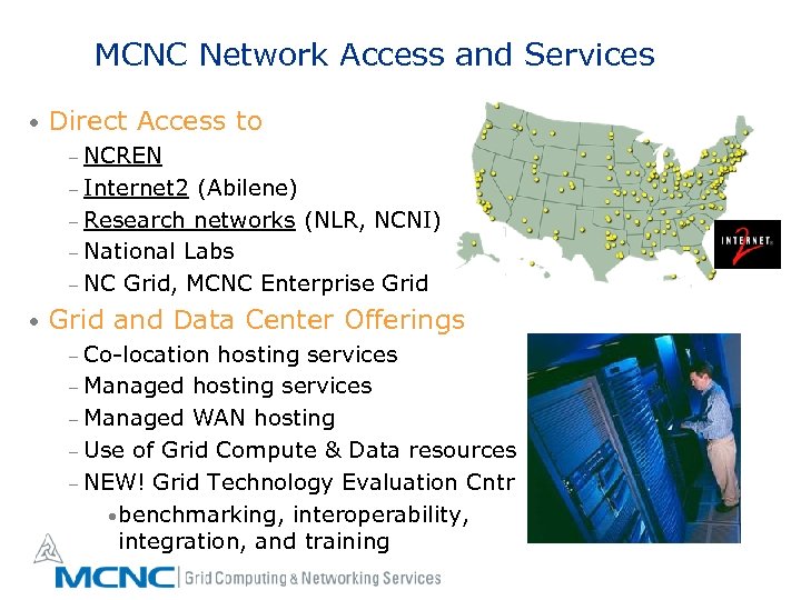 MCNC Network Access and Services • Direct Access to – NCREN – Internet 2 (Abilene) – Research networks (NLR, NCNI) – National Labs – NC Grid, MCNC Enterprise Grid • Grid and Data Center Offerings – Co-location hosting services – Managed WAN hosting – Use of Grid Compute & Data resources – NEW! Grid Technology Evaluation Cntr • benchmarking, interoperability, integration, and training