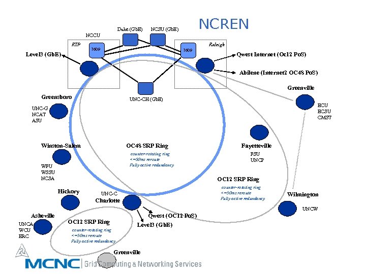 Duke (Gb. E) NCREN NCSU (Gb. E) NCCU RTP Level 3 (Gb. E) Raleigh 7609 Qwest Internet (Oc 12 Po. S) Abilene (Internet 2 OC 48 Po. S) Greenville Greensboro UNC-CH (Gb. E) ECU ECSU CMST UNC-G NCAT ASU Winston-Salem OC 48 SRP Ring counter-rotating ring <=50 ms reroute Fully active redundancy WFU WSSU NCSA Fayetteville FSU UNCP OC 12 SRP Ring Hickory counter-rotating ring <=50 ms reroute Fully active redundancy UNC-C Charlotte Wilmington UNCW Asheville UNCA WCU ERC OC 12 SRP Ring counter-rotating ring <=50 ms reroute Fully active redundancy Qwest (OC 12 Po. S) Level 3 (Gb. E) Greenville