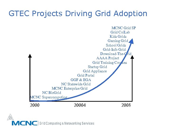GTEC Projects Driving Grid Adoption MCNC Grid SP Grid Col. Lab Kids Grids Gaming Grid School Grids Grid-Info Grid Download-The-Grid AAAA Project Grid Training Courses Startup Grid Appliance Grid Portal GGF & EGA NC Statewide Grid MCNC Enterprise Grid NC Bio. Grid MCNC Supercomputing 20004 2008