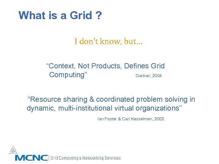 What is a Grid ? I don’t know, but… “Context, Not Products, Defines Grid Computing” Gartner, 2004 “Resource sharing & coordinated problem solving in dynamic, multi-institutional virtual organizations” Ian Foster & Carl Kesselman, 2002