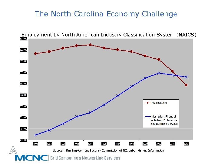 The North Carolina Economy Challenge Employment by North American Industry Classification System (NAICS) Source: The Employment Security Commission of NC, Labor Market Information