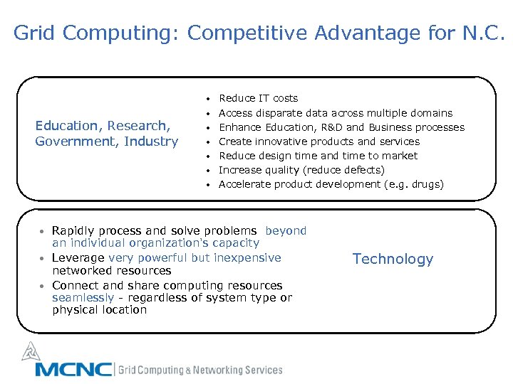 Grid Computing: Competitive Advantage for N. C. • Education, Research, Government, Industry • • • Reduce IT costs Access disparate data across multiple domains Enhance Education, R&D and Business processes Create innovative products and services Reduce design time and time to market Increase quality (reduce defects) Accelerate product development (e. g. drugs) Rapidly process and solve problems beyond an individual organization's capacity Leverage very powerful but inexpensive networked resources Connect and share computing resources seamlessly - regardless of system type or physical location Technology