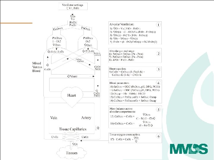 The principle and procedure • Variation of FIO 2 and measurement of ventilatory flow, gasses, Sp. O 2 plus a single blood gas, can be used to calculate pulmonary shunt, low V/Q and high V/Q. • Three to five step changes in FIO 2, each to steady state. • Model analysis and parameter estimation.