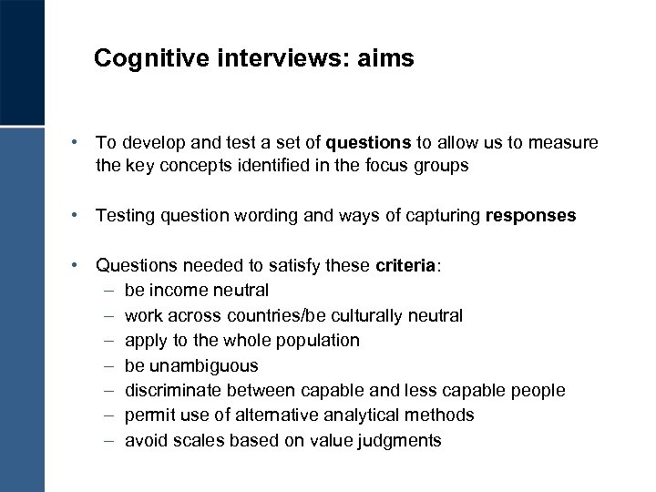 Cognitive interviews: aims • To develop and test a set of questions to allow us to measure the key concepts identified in the focus groups • Testing question wording and ways of capturing responses • Questions needed to satisfy these criteria: – be income neutral – work across countries/be culturally neutral – apply to the whole population – be unambiguous – discriminate between capable and less capable people – permit use of alternative analytical methods – avoid scales based on value judgments