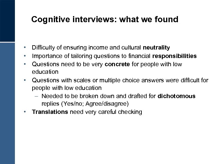Cognitive interviews: what we found • Difficulty of ensuring income and cultural neutrality • Importance of tailoring questions to financial responsibilities • Questions need to be very concrete for people with low education • Questions with scales or multiple choice answers were difficult for people with low education – Needed to be broken down and drafted for dichotomous replies (Yes/no; Agree/disagree) • Translations need very careful checking