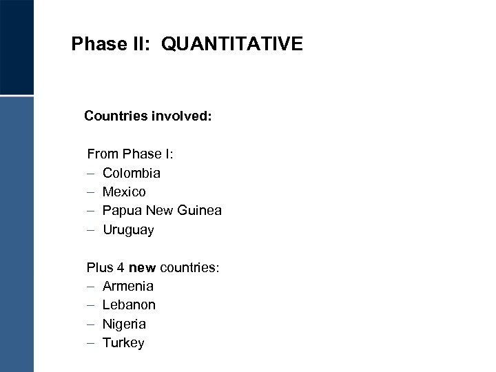 Phase II: QUANTITATIVE Countries involved: From Phase I: – Colombia – Mexico – Papua New Guinea – Uruguay Plus 4 new countries: – Armenia – Lebanon – Nigeria – Turkey