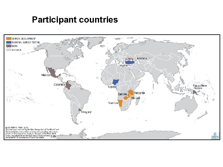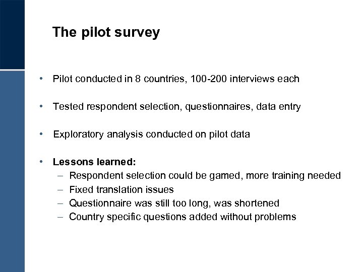 The pilot survey • Pilot conducted in 8 countries, 100 -200 interviews each • Tested respondent selection, questionnaires, data entry • Exploratory analysis conducted on pilot data • Lessons learned: – Respondent selection could be gamed, more training needed – Fixed translation issues – Questionnaire was still too long, was shortened – Country specific questions added without problems