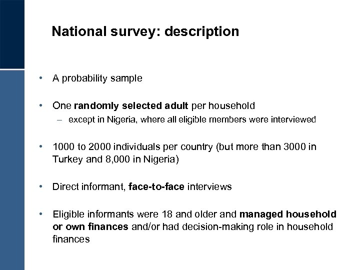 National survey: description • A probability sample • One randomly selected adult per household – except in Nigeria, where all eligible members were interviewed • 1000 to 2000 individuals per country (but more than 3000 in Turkey and 8, 000 in Nigeria) • Direct informant, face-to-face interviews • Eligible informants were 18 and older and managed household or own finances and/or had decision-making role in household finances