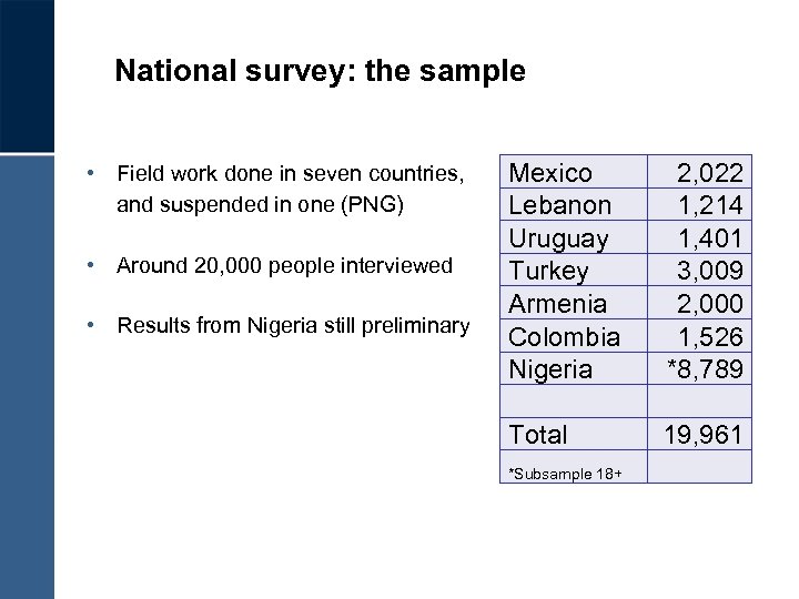 National survey: the sample • Field work done in seven countries, and suspended in one (PNG) • Around 20, 000 people interviewed • Results from Nigeria still preliminary Mexico Lebanon Uruguay Turkey Armenia Colombia Nigeria 2, 022 1, 214 1, 401 3, 009 2, 000 1, 526 *8, 789 Total 19, 961 *Subsample 18+