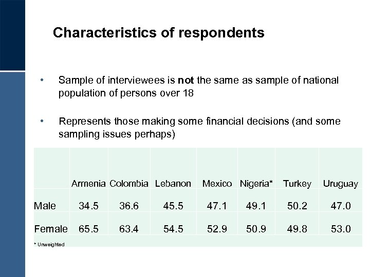 Characteristics of respondents • Sample of interviewees is not the same as sample of national population of persons over 18 • Represents those making some financial decisions (and some sampling issues perhaps) Armenia Colombia Lebanon Mexico Nigeria* Turkey Uruguay Male 34. 5 36. 6 45. 5 47. 1 49. 1 50. 2 47. 0 Female 65. 5 63. 4 54. 5 52. 9 50. 9 49. 8 53. 0 * Unweighted