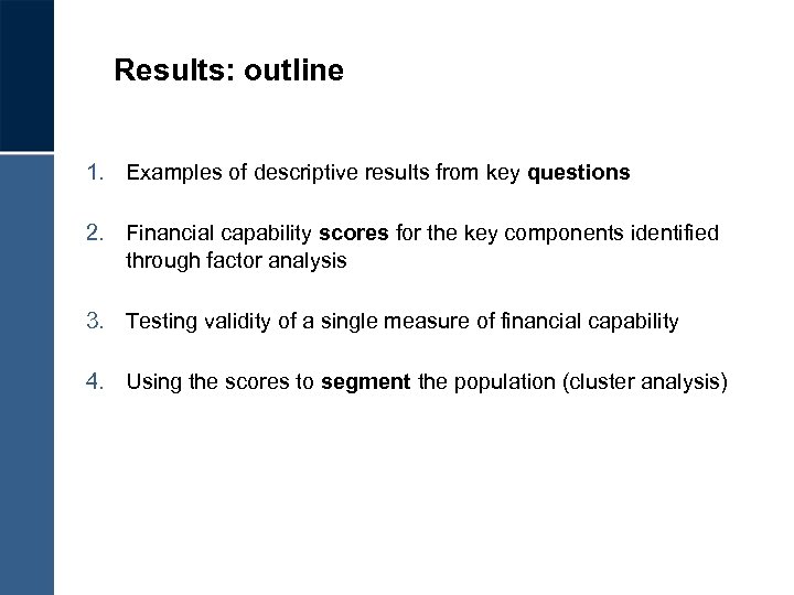 Results: outline 1. Examples of descriptive results from key questions 2. Financial capability scores for the key components identified through factor analysis 3. Testing validity of a single measure of financial capability 4. Using the scores to segment the population (cluster analysis)