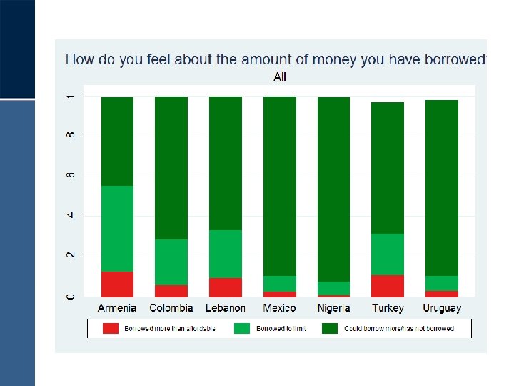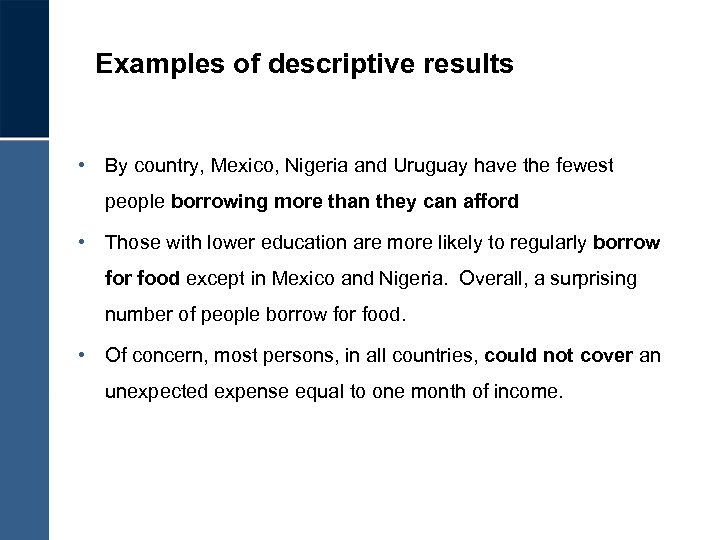 Examples of descriptive results • By country, Mexico, Nigeria and Uruguay have the fewest people borrowing more than they can afford • Those with lower education are more likely to regularly borrow for food except in Mexico and Nigeria. Overall, a surprising number of people borrow for food. • Of concern, most persons, in all countries, could not cover an unexpected expense equal to one month of income.