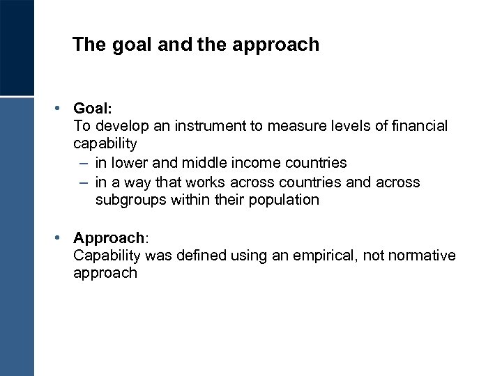 The goal and the approach • Goal: To develop an instrument to measure levels of financial capability – in lower and middle income countries – in a way that works across countries and across subgroups within their population • Approach: Capability was defined using an empirical, not normative approach