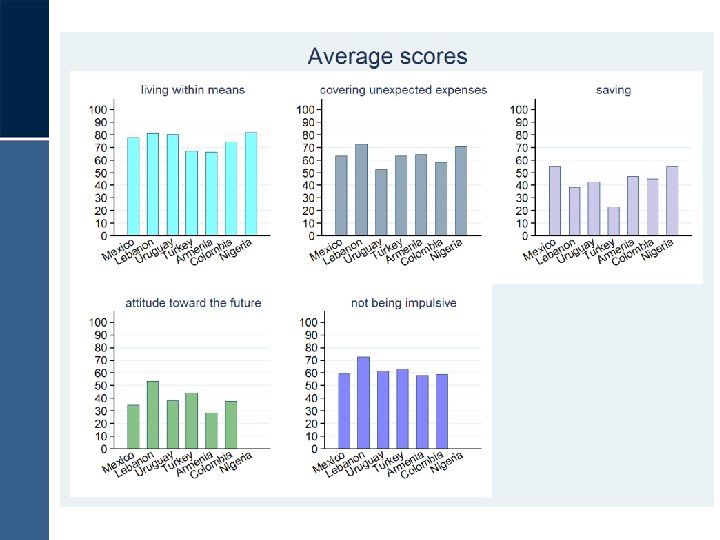 Financial capability scores • We can construct valid and comparable scores for 12 components of financial capability across countries, reflecting concepts most cited in FGs • 10 of these components apply to the entire population: 1. Budgeting 2. Living within means 3. Monitoring expenses 4. Not overspending 5. Using information 6. Covering unexpected expenses 7. Saving 8. Attitude towards the future 9. Not being impulsive 10. Achievement orientation