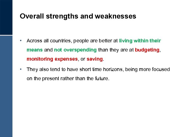 Overall strengths and weaknesses • Across all countries, people are better at living within their means and not overspending than they are at budgeting, monitoring expenses, or saving. • They also tend to have short time horizons, being more focused on the present rather than the future.