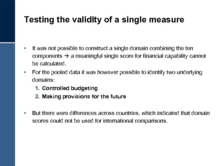 Testing the validity of a single measure • It was not possible to construct a single domain combining the ten components a meaningful single score for financial capability cannot be calculated. • For the pooled data it was however possible to identify two underlying domains: 1. Controlled budgeting 2. Making provisions for the future • But there were differences across countries, which indicated that domain scores could not be used for international comparisons.