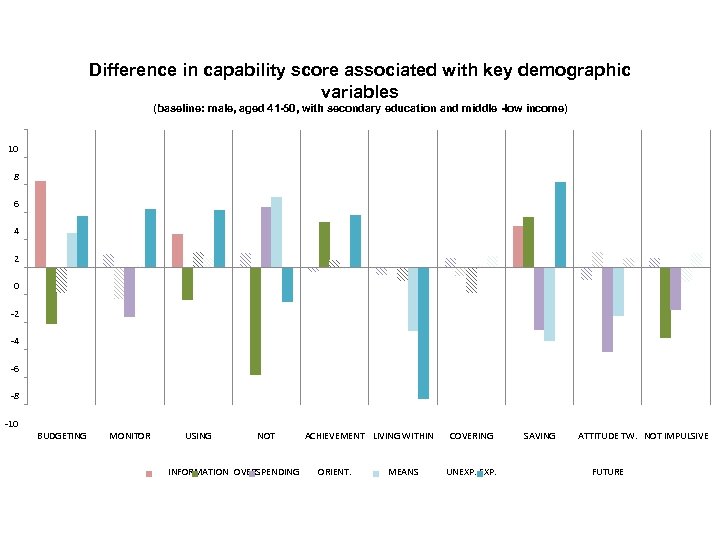 Difference in capability score associated with key demographic variables (baseline: male, aged 41 -50, with secondary education and middle -low income) 10 8 6 4 2 0 -2 -4 -6 -8 -10 BUDGETING MONITOR USING NOT INFORMATION OVERSPENDING Female Age 18 -30 ACHIEVEMENT LIVING WITHIN ORIENT. Primary education at most MEANS COVERING SAVING UNEXP. Lowest income group Has financial products ATTITUDE TW. NOT IMPULSIVE FUTURE