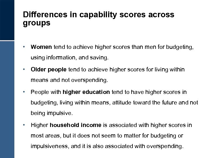Differences in capability scores across groups • Women tend to achieve higher scores than men for budgeting, using information, and saving. • Older people tend to achieve higher scores for living within means and not overspending. • People with higher education tend to have higher scores in budgeting, living within means, attitude toward the future and not being impulsive. • Higher household income is associated with higher scores in most areas, but it does not seem to matter for budgeting or impulsiveness, and it is also associated with overspending.