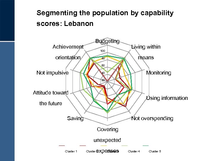 Segmenting the population by capability scores: Lebanon Achievement Budgeting 120 100 orientation 80 Living within means 60 Not impulsive Monitoring 40 20 0 Attitude toward Using information the future Saving Not overspending Covering unexpected Cluster 1 Cluster 3 expenses Cluster 2 Cluster 4 Cluster 5
