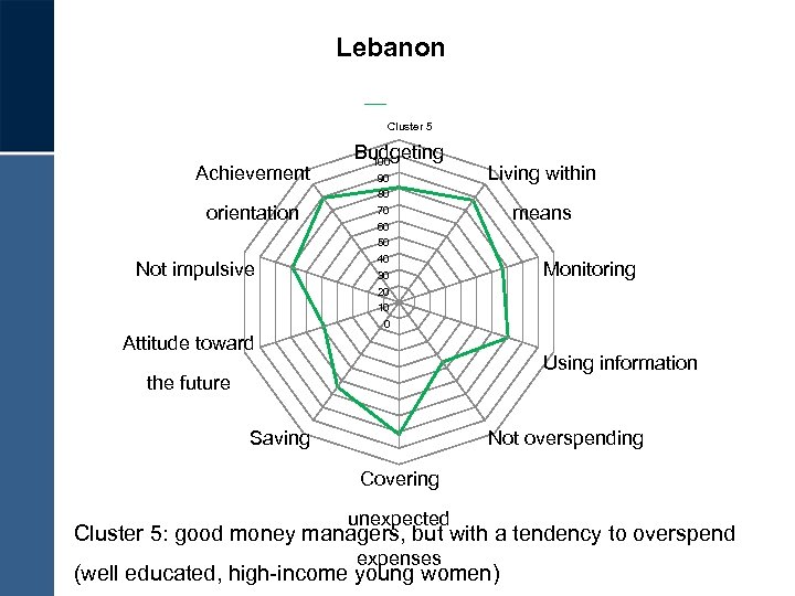 Lebanon Cluster 5 Achievement orientation Not impulsive Budgeting 100 90 80 70 60 50 40 30 20 10 0 Living within means Monitoring Attitude toward Using information the future Saving Not overspending Covering unexpected Cluster 5: good money managers, but with a tendency to overspend expenses (well educated, high-income young women)