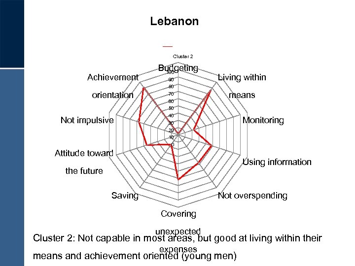 Lebanon Cluster 2 Achievement orientation Not impulsive Budgeting 100 90 80 70 60 50 40 30 20 10 0 Living within means Monitoring Attitude toward Using information the future Saving Not overspending Covering unexpected Cluster 2: Not capable in most areas, but good at living within their expenses means and achievement oriented (young men)