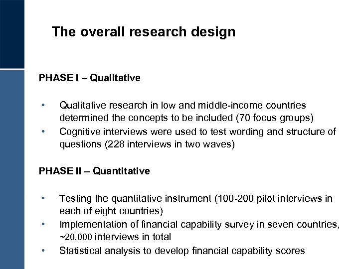 The overall research design PHASE I – Qualitative • • Qualitative research in low and middle-income countries determined the concepts to be included (70 focus groups) Cognitive interviews were used to test wording and structure of questions (228 interviews in two waves) PHASE II – Quantitative • • • Testing the quantitative instrument (100 -200 pilot interviews in each of eight countries) Implementation of financial capability survey in seven countries, ~20, 000 interviews in total Statistical analysis to develop financial capability scores