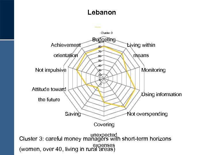 Lebanon Cluster 3 Achievement orientation Budgeting 90 80 70 60 Living within means 50 Not impulsive 40 30 Monitoring 20 10 0 Attitude toward Using information the future Saving Not overspending Covering unexpected Cluster 3: careful money managers with short-term horizons expenses (women, over 40, living in rural areas)