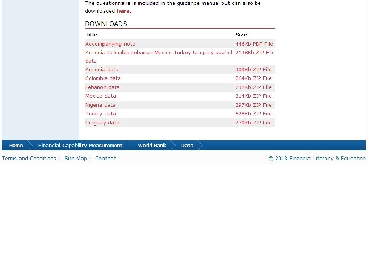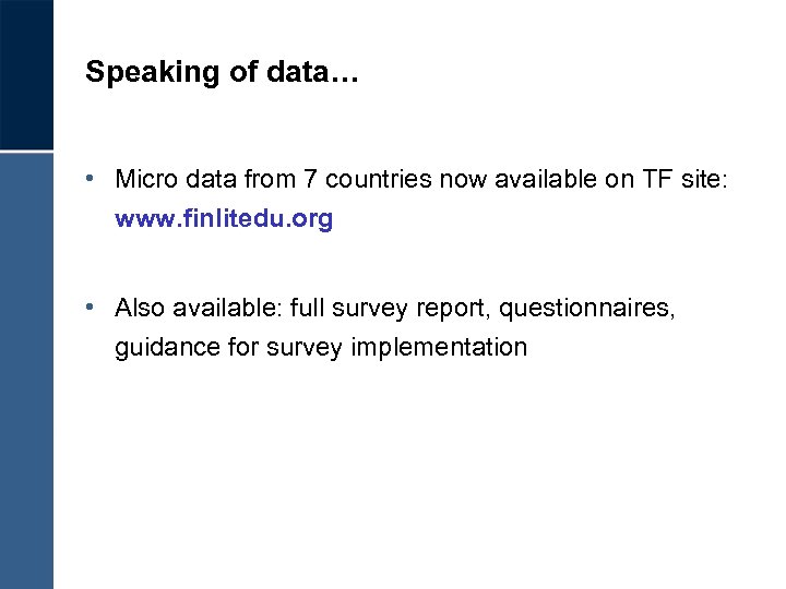 Speaking of data… • Micro data from 7 countries now available on TF site: www. finlitedu. org • Also available: full survey report, questionnaires, guidance for survey implementation