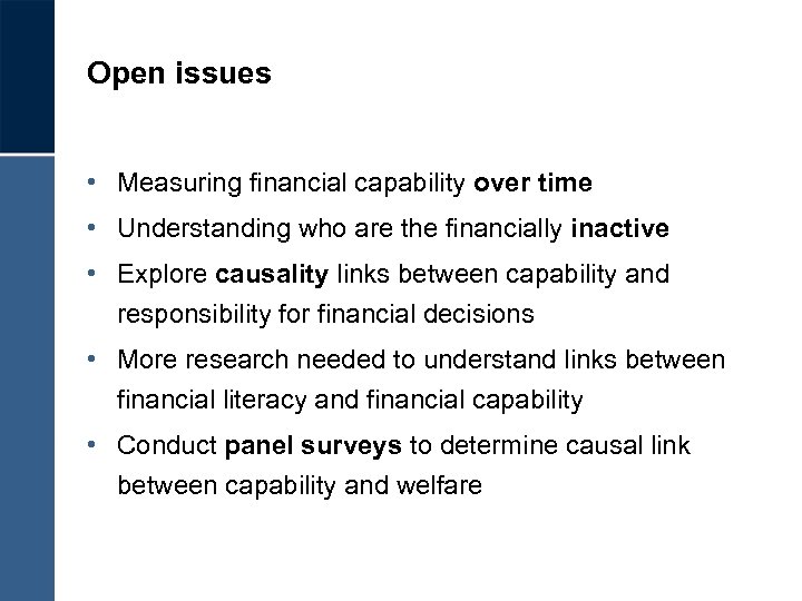 Open issues • Measuring financial capability over time • Understanding who are the financially inactive • Explore causality links between capability and responsibility for financial decisions • More research needed to understand links between financial literacy and financial capability • Conduct panel surveys to determine causal link between capability and welfare