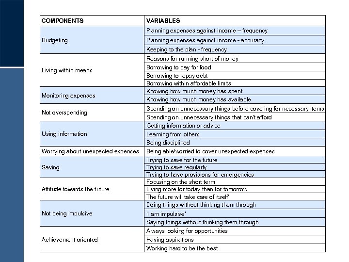 COMPONENTS VARIABLES Planning expenses against income – frequency Budgeting Planning expenses against income - accuracy Keeping to the plan - frequency Living within means Monitoring expenses Not overspending Using information Worrying about unexpected expenses Saving Attitude towards the future Not being impulsive Reasons for running short of money Borrowing to pay for food Borrowing to repay debt Borrowing within affordable limits Knowing how much money has spent Knowing how much money has available Spending on unnecessary things before covering for necessary items Spending on unnecessary things that can't afford Getting information or advice Learning from others Being disciplined Being able/worried to cover unexpected expenses Trying to save for the future Trying to save regularly Trying to have provisions for emergencies Focusing on the short term Living more for today than for tomorrow The future will take care of itself' Doing things without thinking them through ‘I am impulsive' Saying things without thinking them through Always looking for opportunities Achievement oriented Having aspirations Working hard to be the best