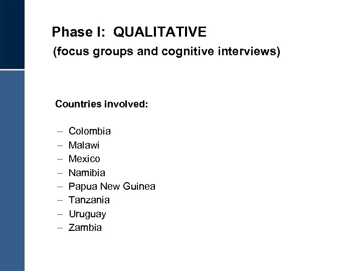 Phase I: QUALITATIVE (focus groups and cognitive interviews) Countries involved: – – – – Colombia Malawi Mexico Namibia Papua New Guinea Tanzania Uruguay Zambia