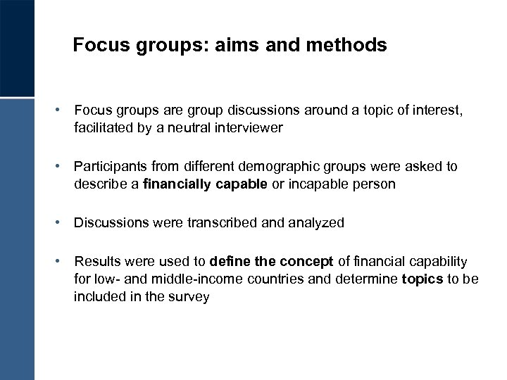 Focus groups: aims and methods • Focus groups are group discussions around a topic of interest, facilitated by a neutral interviewer • Participants from different demographic groups were asked to describe a financially capable or incapable person • Discussions were transcribed analyzed • Results were used to define the concept of financial capability for low- and middle-income countries and determine topics to be included in the survey