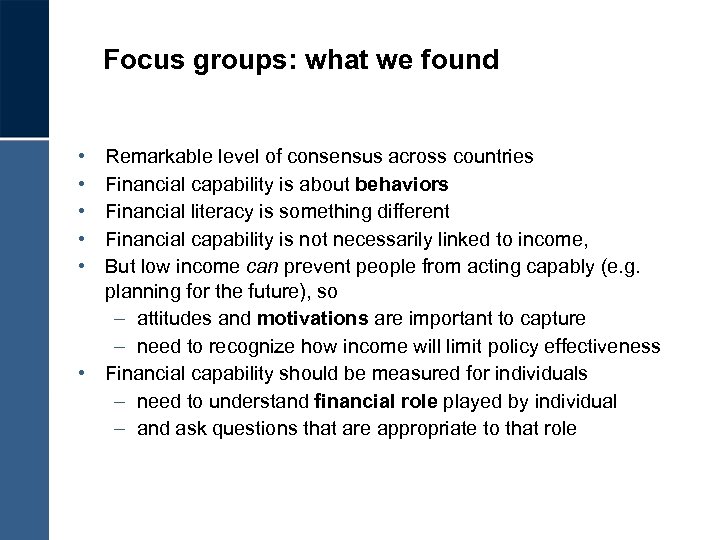 Focus groups: what we found • • • Remarkable level of consensus across countries Financial capability is about behaviors Financial literacy is something different Financial capability is not necessarily linked to income, But low income can prevent people from acting capably (e. g. planning for the future), so – attitudes and motivations are important to capture – need to recognize how income will limit policy effectiveness • Financial capability should be measured for individuals – need to understand financial role played by individual – and ask questions that are appropriate to that role