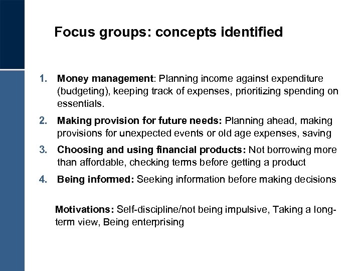 Focus groups: concepts identified 1. Money management: Planning income against expenditure (budgeting), keeping track of expenses, prioritizing spending on essentials. 2. Making provision for future needs: Planning ahead, making provisions for unexpected events or old age expenses, saving 3. Choosing and using financial products: Not borrowing more than affordable, checking terms before getting a product 4. Being informed: Seeking information before making decisions Motivations: Self-discipline/not being impulsive, Taking a longterm view, Being enterprising
