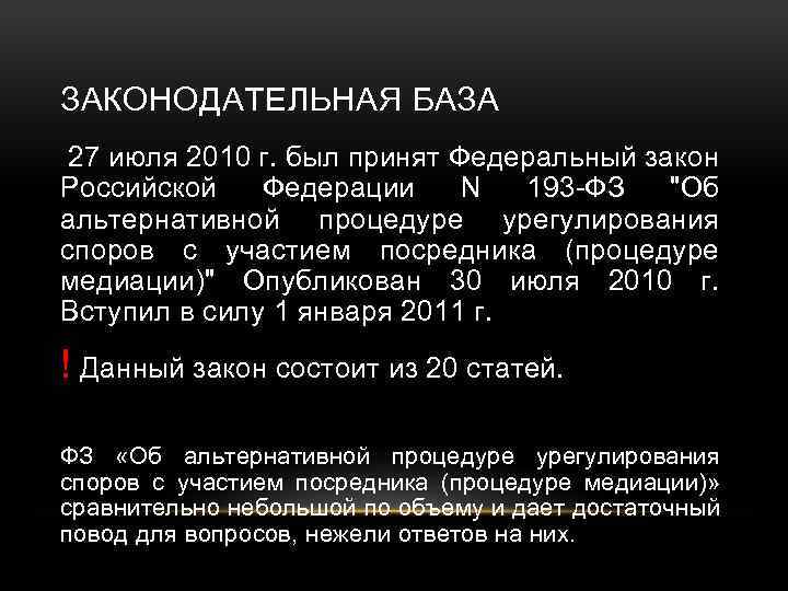 ЗАКОНОДАТЕЛЬНАЯ БАЗА 27 июля 2010 г. был принят Федеральный закон Российской Федерации N 193 -ФЗ "Об альтернативной процедуре урегулирования споров с участием посредника (процедуре медиации)" Опубликован 30 июля 2010 г. Вступил в силу 1 января 2011 г. ! Данный закон состоит из 20 статей. ФЗ «Об альтернативной процедуре урегулирования споров с участием посредника (процедуре медиации)» сравнительно небольшой по объему и дает достаточный повод для вопросов, нежели ответов на них.