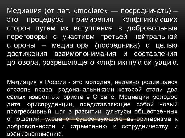 Медиация (от лат. «mediare» — посредничать) – это процедура примирения конфликтующих сторон путем их вступления в добровольные переговоры с участием третьей нейтральной стороны – медиатора (посредника) с целью достижения взаимопонимания и составления договора, разрешающего конфликтную ситуацию. Медиация в России - это молодая, недавно родившаяся отрасль права, родоначальниками которой стали два самых известных юриста в Стране. Медиация молодое дитя юриспруденции, представляющее собой новый прогрессивный шаг в развитии культуры общественных отношений, ухода от существующего авторитаризма к добровольности и стремлению к сотрудничеству и взаимопониманию.