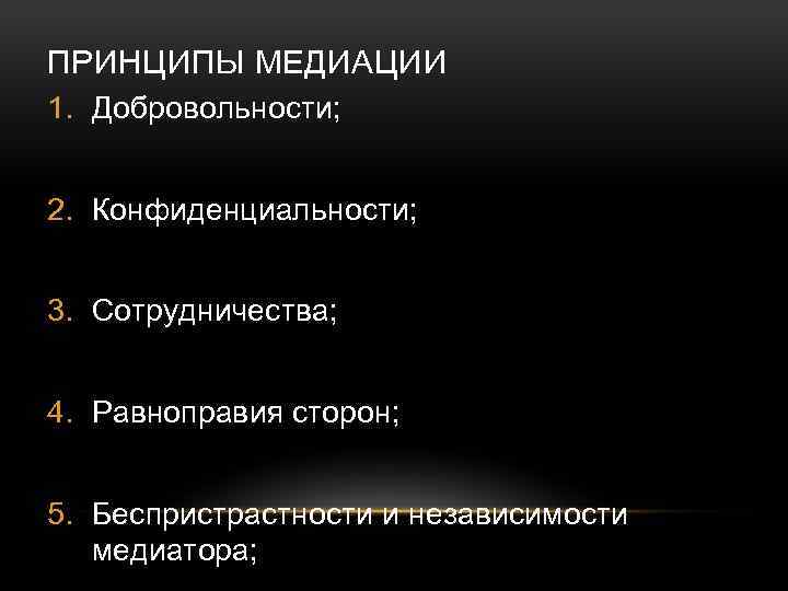 ПРИНЦИПЫ МЕДИАЦИИ 1. Добровольности; 2. Конфиденциальности; 3. Сотрудничества; 4. Равноправия сторон; 5. Беспристрастности и независимости медиатора;