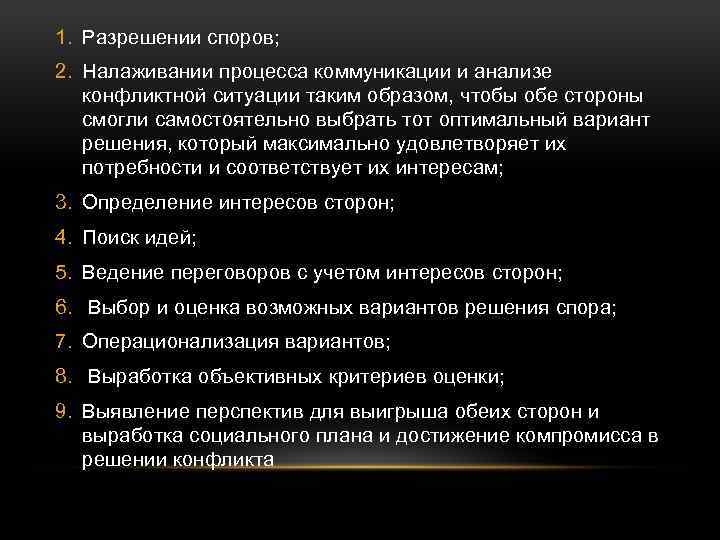 1. Разрешении споров; 2. Налаживании процесса коммуникации и анализе конфликтной ситуации таким образом, чтобы обе стороны смогли самостоятельно выбрать тот оптимальный вариант решения, который максимально удовлетворяет их потребности и соответствует их интересам; 3. Определение интересов сторон; 4. Поиск идей; 5. Ведение переговоров с учетом интересов сторон; 6. Выбор и оценка возможных вариантов решения спора; 7. Операционализация вариантов; 8. Выработка объективных критериев оценки; 9. Выявление перспектив для выигрыша обеих сторон и выработка социального плана и достижение компромисса в решении конфликта